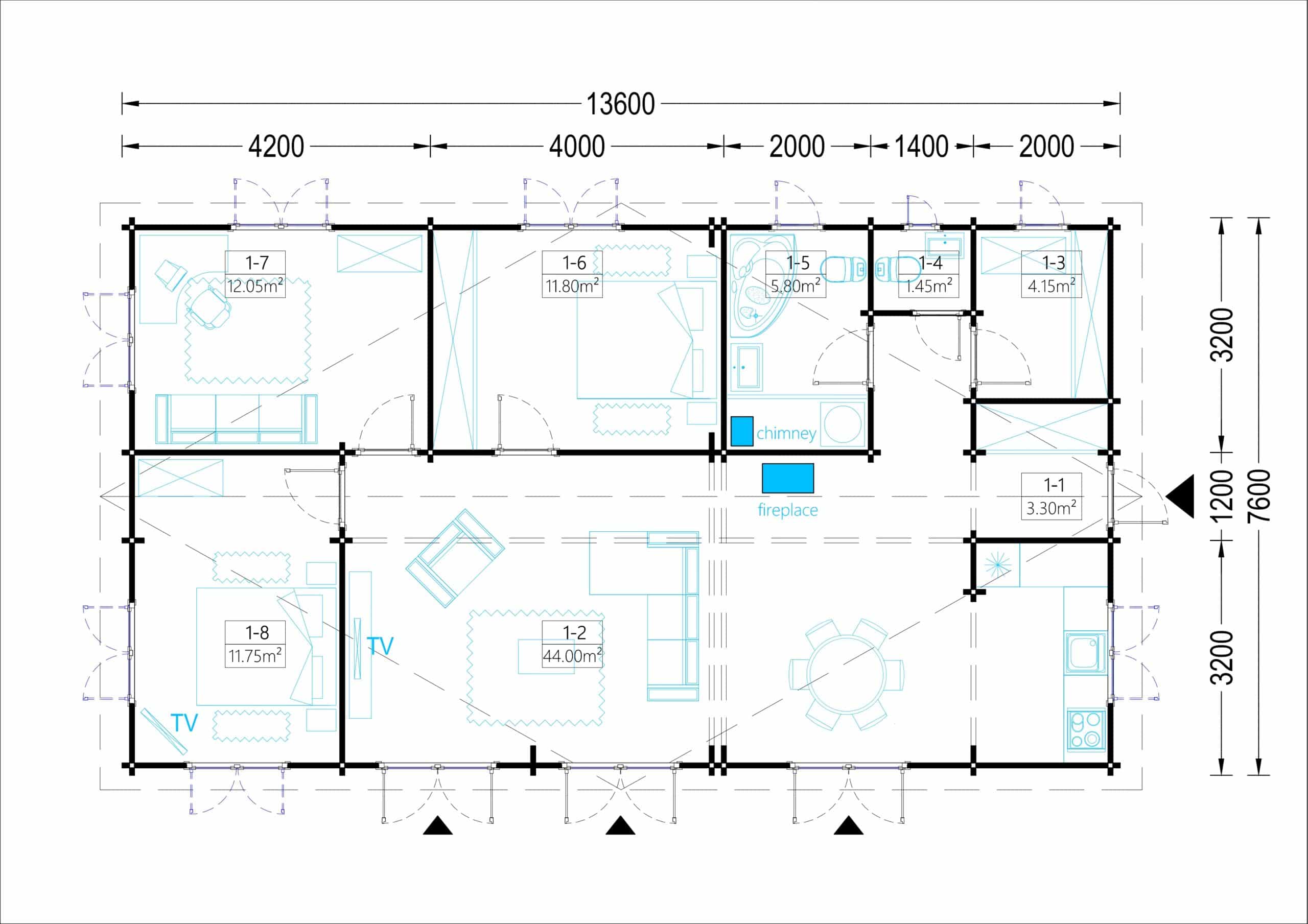 - Das 44 m² große Wohnzimmer mit offener Küche ist das Herzstück des Hauses. Dieser Bereich ist ideal für gemütliche Zusammenkünfte vor einem warmen Kamin und bietet ausreichend Platz für Familienaktivitäten.