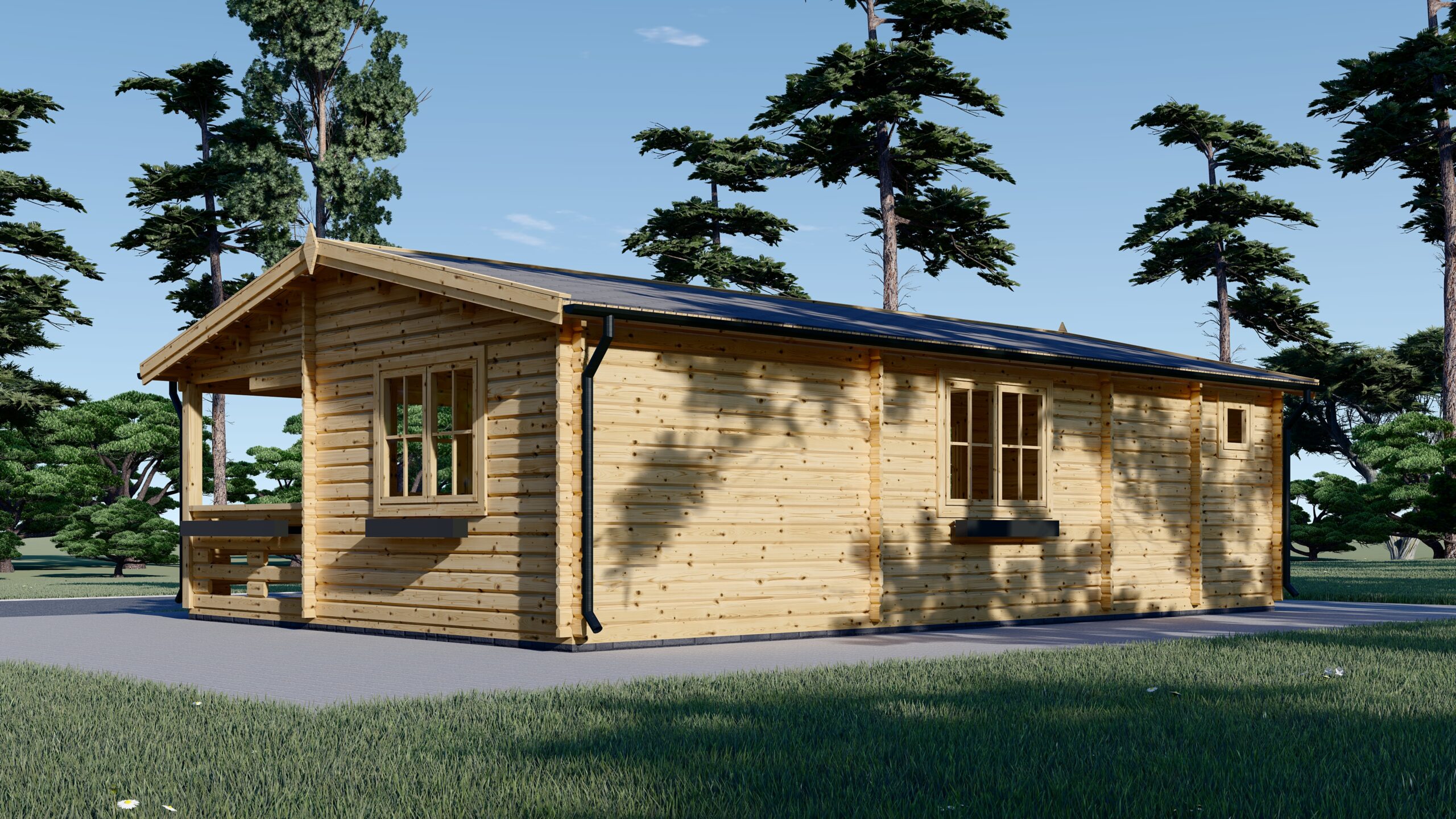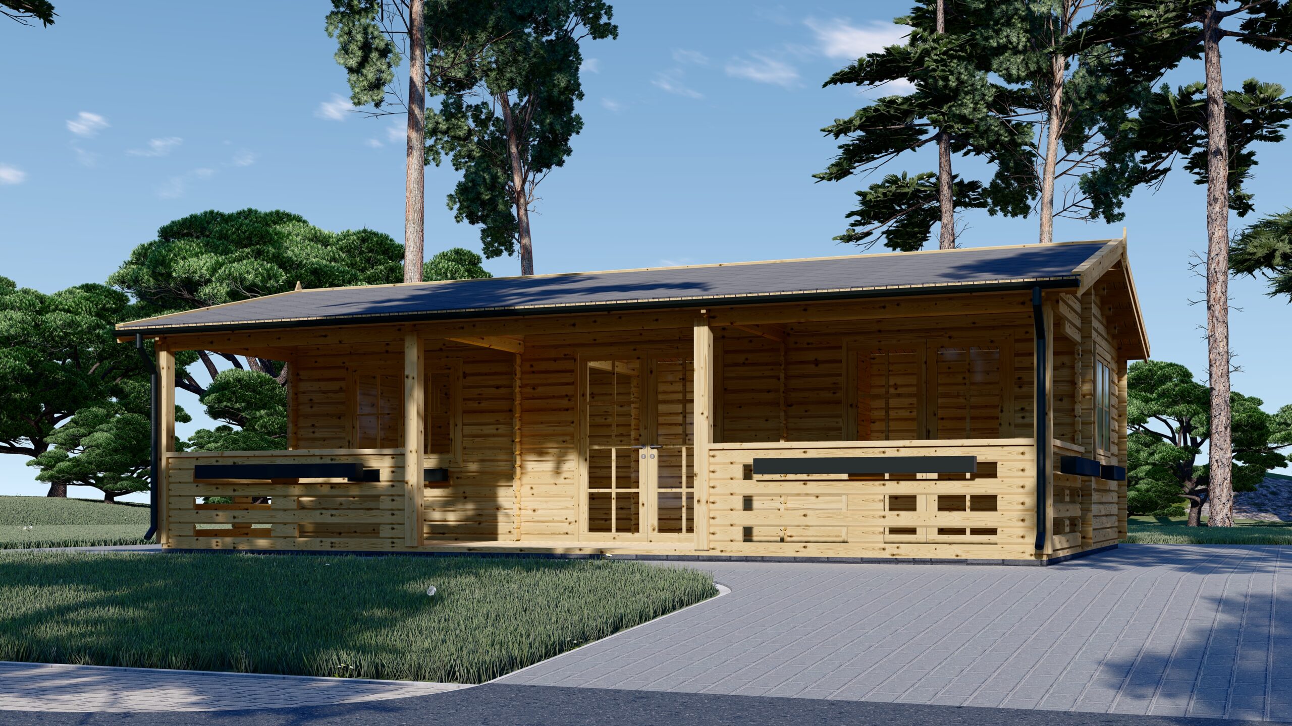 Blockbohlenhaus LILLI (44+44 mm) · Extra Isoliert · 32 m² + 20 m² überdachte Terrasse