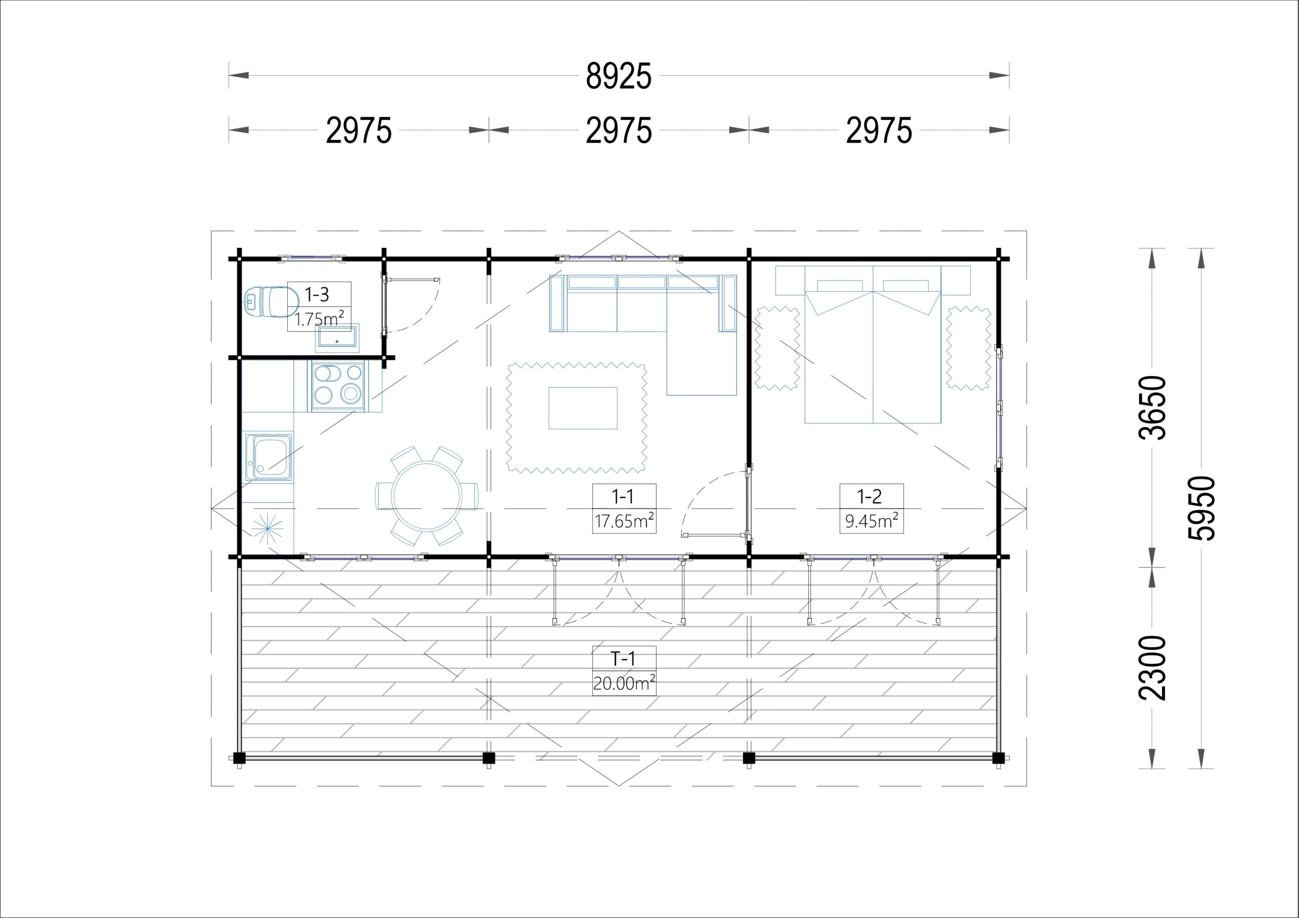 Blockbohlenhaus LILLI (44–66 mm) · 32 m² + 20 m² überdachte Terrasse
