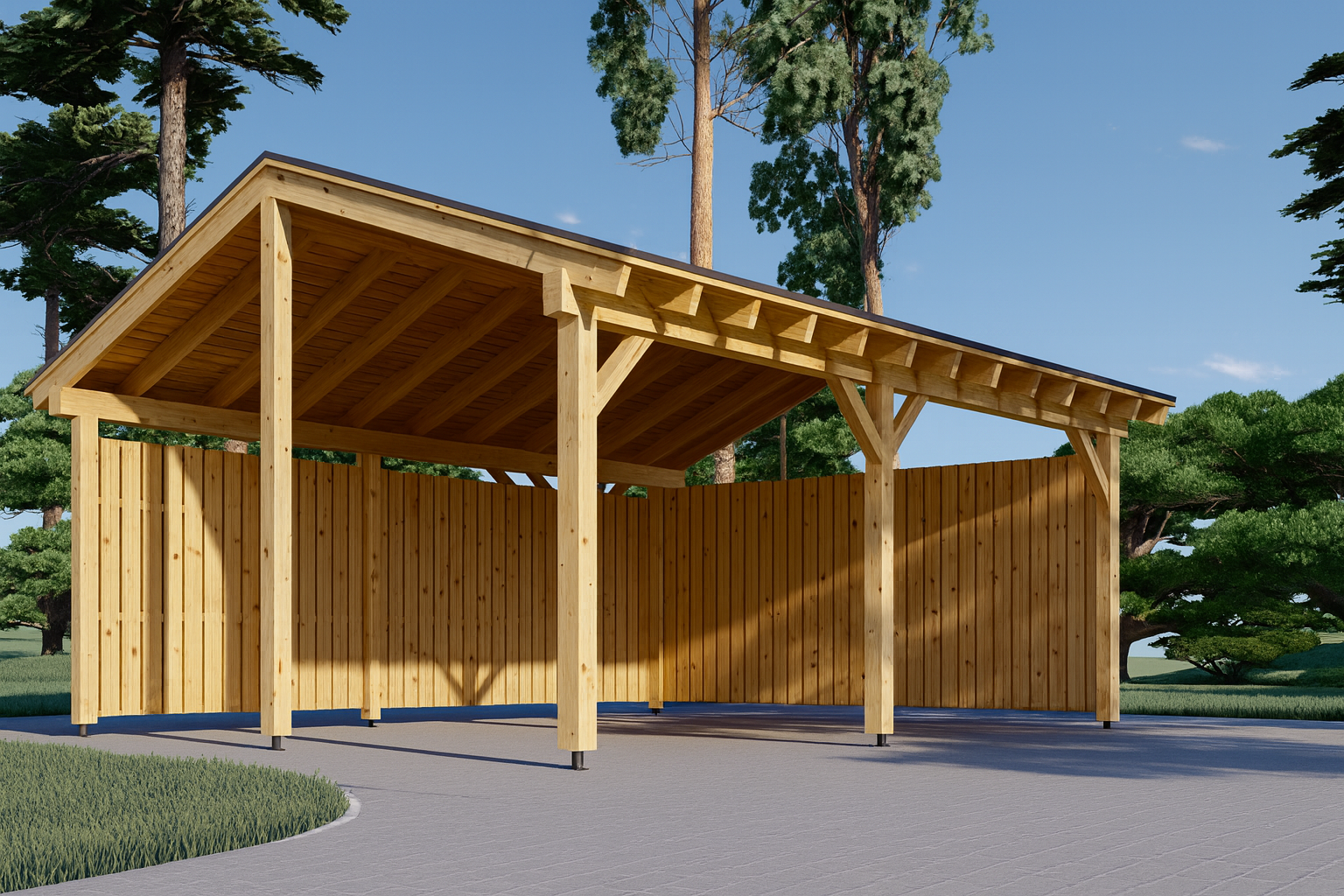 Mit einer Fläche von 6 × 6 m bietet SANDRA+ reichlich Raum für zwei Autos, Fahrräder oder Gartengeräte. Die offene Konstruktion ermöglicht bequemes Ein- und Ausfahren.