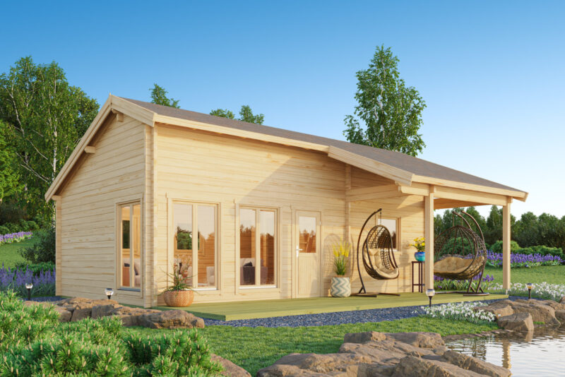 Ferienhaus mit Terrasse und Geländer 70 mm, Fundamentmass 5750×6250, Naturbelassen