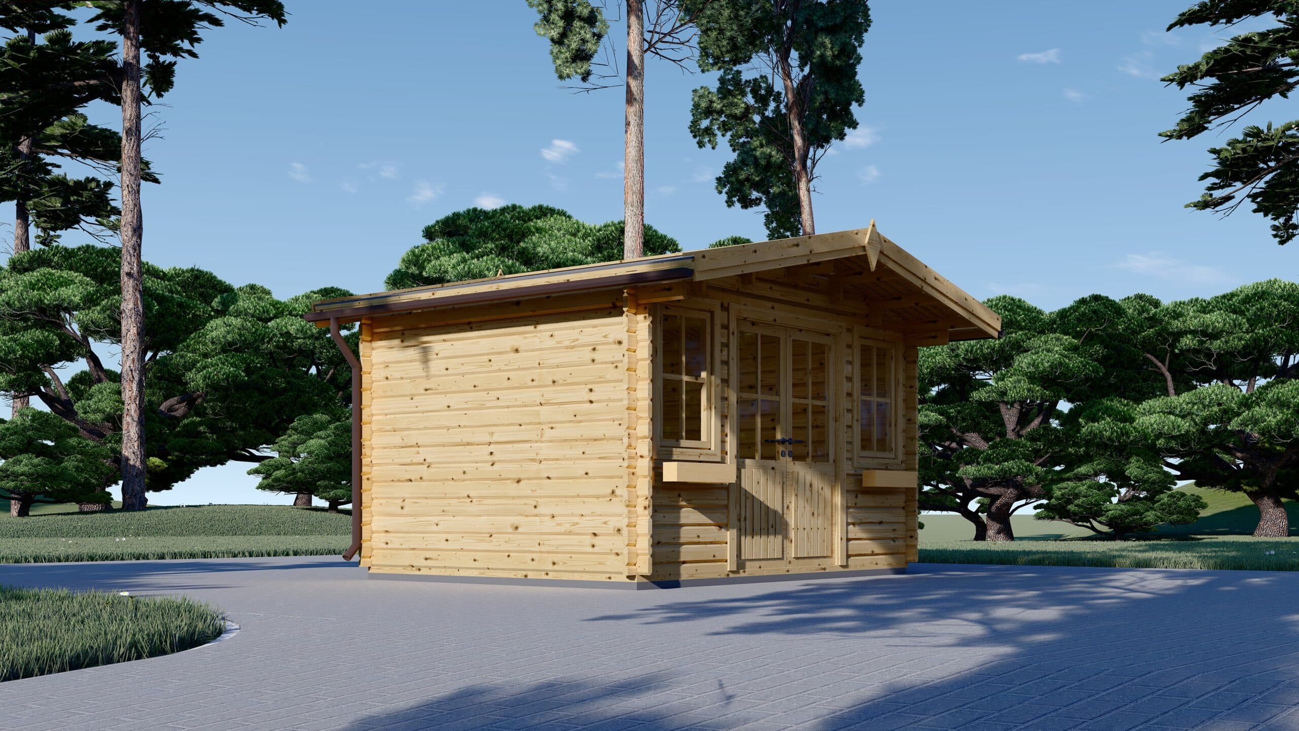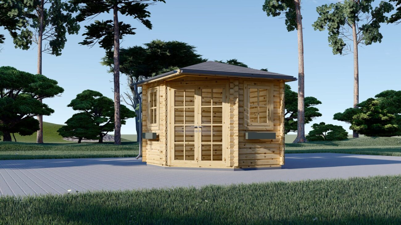 Das Gartenhaus OLIVER (44 mm) mit einer Grundfläche von 12 m² und doppelt verglasten Fenstern bietet eine attraktive und funktionale Lösung.