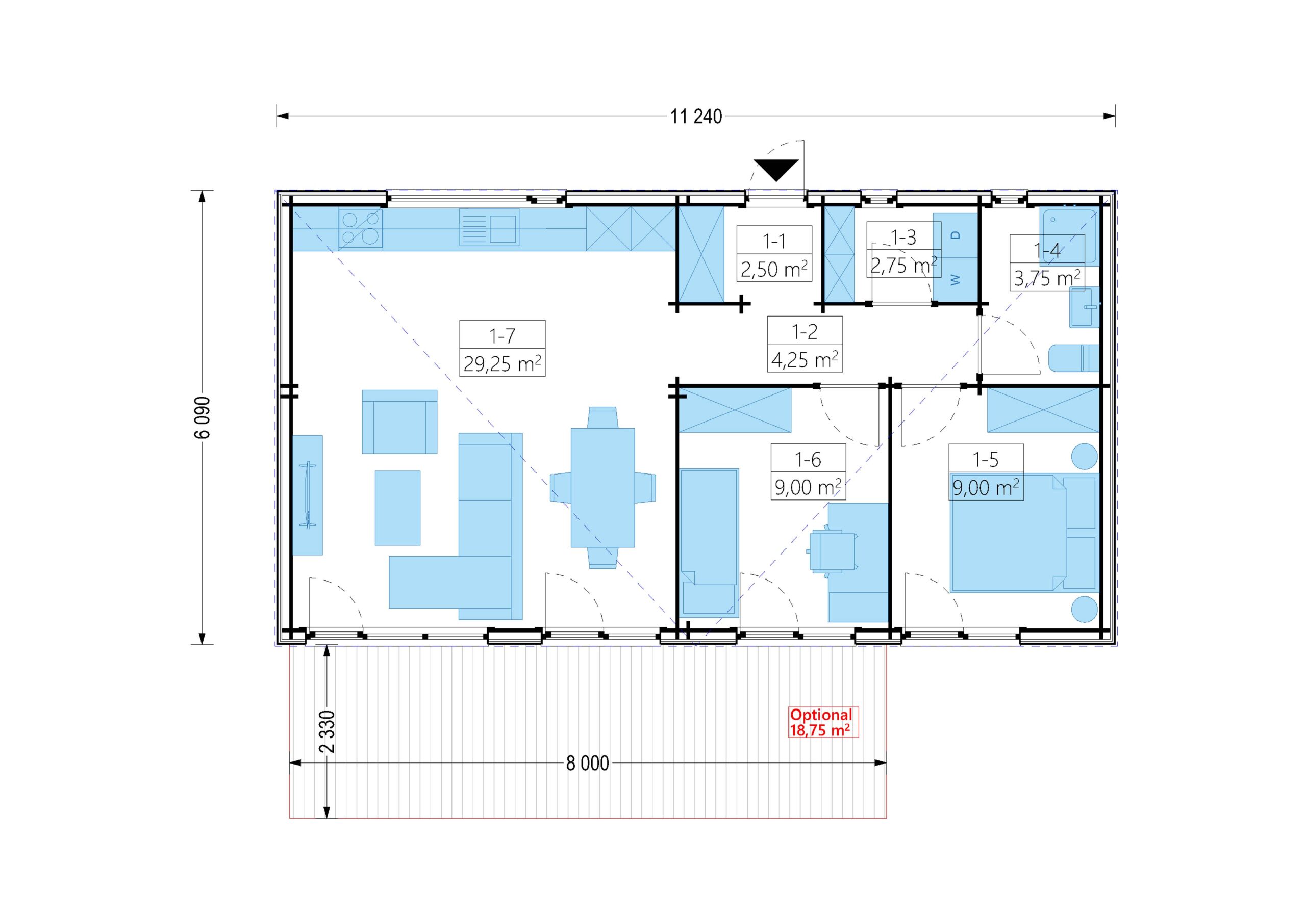 Mit einer Wohnfläche von 60 m², zwei gemütlichen Schlafzimmern und einem hellen, offenen Wohnbereich bietet dieses Modell alles, was Sie für komfortables Wohnen oder entspannte Ferienmomente benötigen.