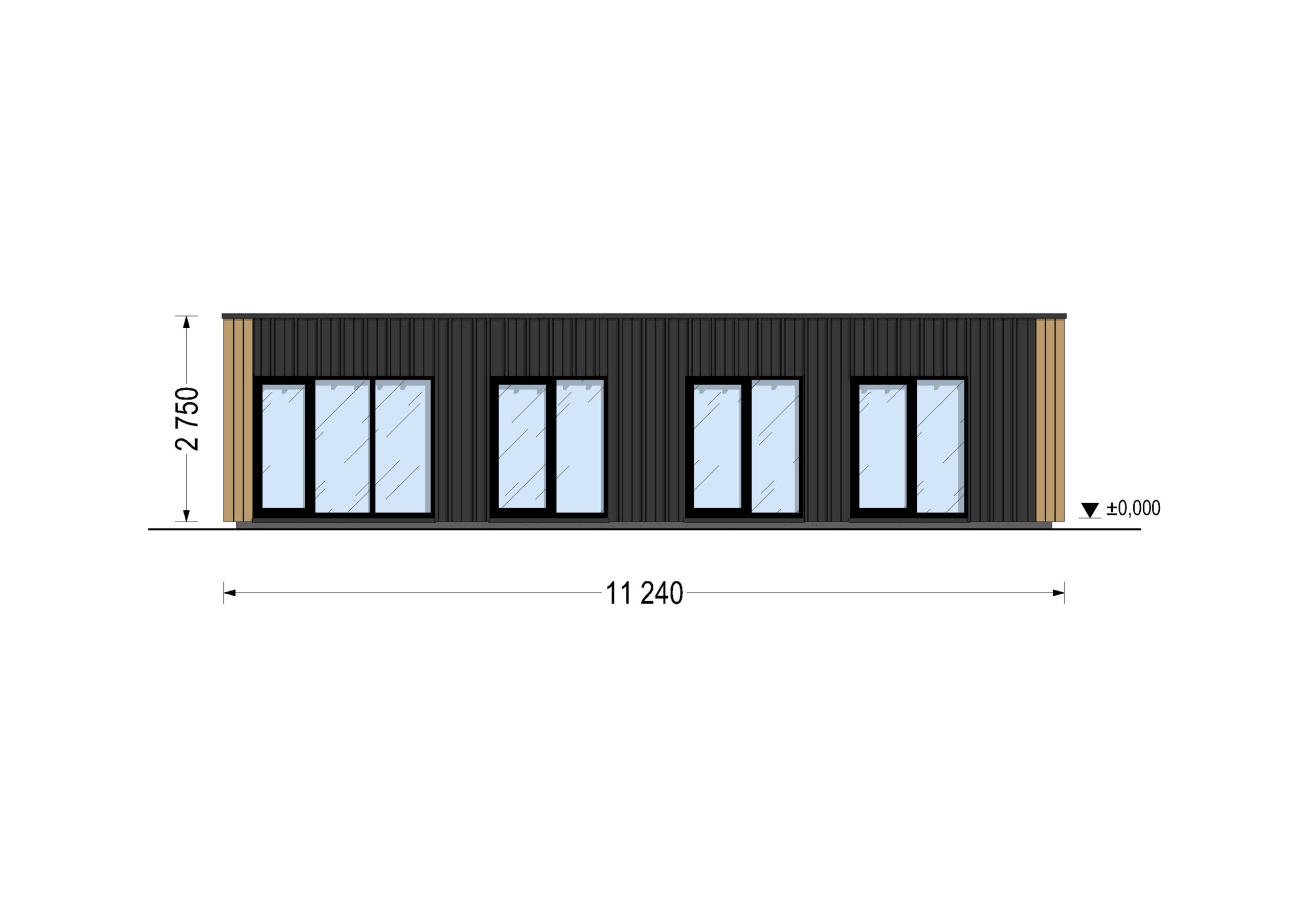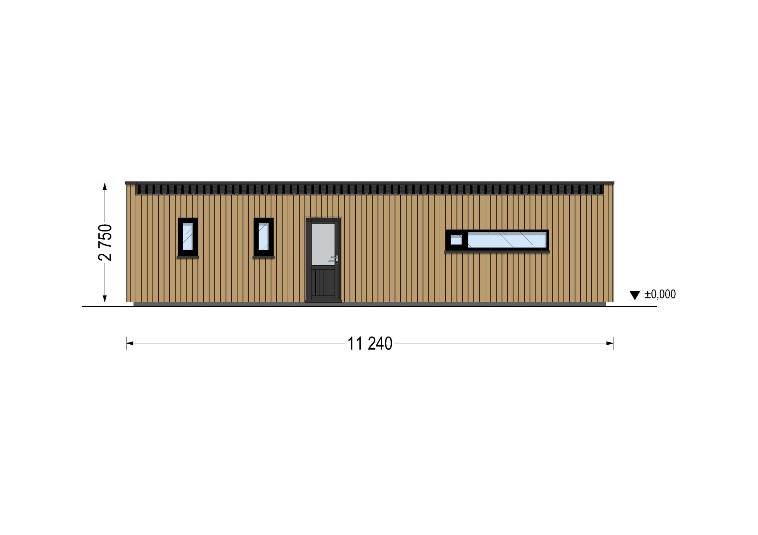 Das flache Dach verleiht dem Modell eine moderne, architektonische Note, während die vertikale Holzverschalung die natürliche Schönheit des hochwertigen Nadelholzes unterstreicht.